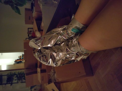 Öppna förpackningen, vik upp strumporna och sätt på dem på rena, torra fötter. Förslut strumpan kring fotleden med det medföljande klistermärket och ta det lugnt i minst 10 minuter. Ta av strumporna och släng dem. Du behöver inte skölja av fötterna efteråt.