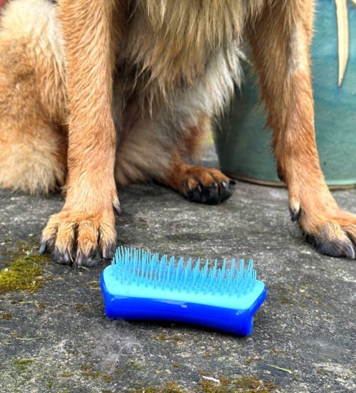 Med hjälp av patenterad utformning med piggar i två längder, de längre piggarna tar försiktigt bort smuts och når tryggt ner till underullen, medan de kortare piggarna plockar upp löst täckhår. Den här lugnande färgen i marinblått och himmelsblått kommer att få er båda att slappna av.