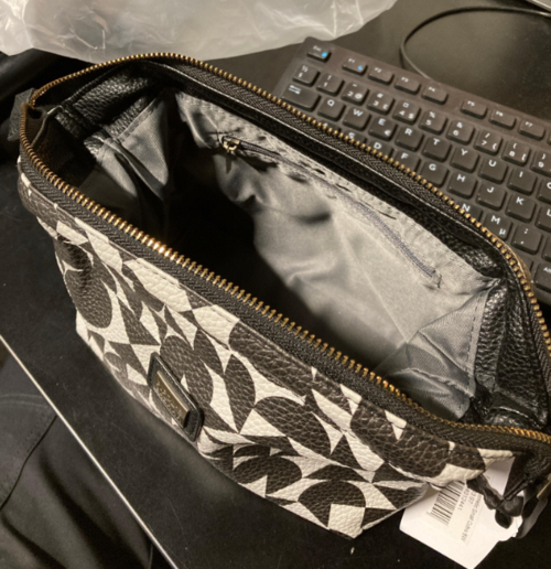 Rymlig necessär i printat konstläder. Invändigt finns två mindre öppna fickor samt en ficka med dragkedja, fodrad i svart nylon. Necessären har en vid öppning som får extra stadga med hjälp av en metallram.