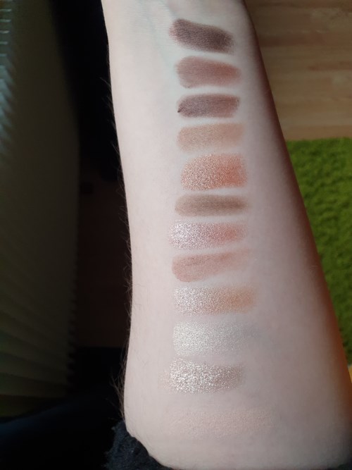 Det här är en mycket fin palett med vackra, jordnära nyanser (fem matta och sju skimriga) som man kan använda sig av när man vill skapa allt från en diskret dagslook till en dramatisk kvällslook. Själv föredrar jag såna här nyanser, eftersom jag anser att jag inte passar i färgglada skuggor. Det är helt enkelt inte jag. 🙃 Bilderna jag har laddat upp togs när paletten var helt ny (den är nämligen inte lika fin längre 😁). Jag har swatchat skuggorna med fingrarna, utan primer under, och som ni ser är de väldigt pigmenterade och de är lika pigmenterade när man applicerar dem med borste, så man bör vara försiktig. Den enda skuggan jag inte är förtjust i är den första i raden högst upp. Pigmenten i den är nästan obefintliga, så den är värdelös som basskugga, men funkar däremot bra till att korrigera om man till exempel har råkat göra för skarpa kanter eller har dragit skuggan för långt ut. Var extra försiktig med den bredvid, för den är väldigt mjuk och glittrig, och den tredje nyansen på samma rad syns bäst med fuktad borste, om man vill ha en stark highlighteffekt. Skuggorna i denna palett är lätta att blanda och tona, och sitter där de ska. Jag använder NYX HD Eyeshadow Base som grund. #tävling - Inlägget skapades 2 årBetyg: 2 av 5