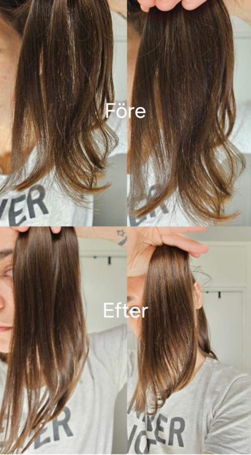 Jag har testat denna balm i cirka två veckor, tillsammans med andra produkter i samma serie. Jag har använt den både i handdukstorkat hår innan föning och i torrt hår mellan tvättar. Redan efter första användningen märkte jag en tydlig skillnad, balmen verkar försluta mina kluvna toppar och få avbrutna hårstrån att se mindre slitna ut. Håret känns mjukare, ser glansigare ut och ger ett friskare helhetsintryck. Kan inte säga om produkten faktiskt stärker och reparerar skadat hår på djupet, som den lovar. Men den omedelbara effekten jag upplever är verkligen imponerande. Är den värd hypen - ta en titt på före- och efterbilderna! Recensionen genomfördes på uppdrag av Smartson - testpiloten har fått prova produkten kostnadsfritt.