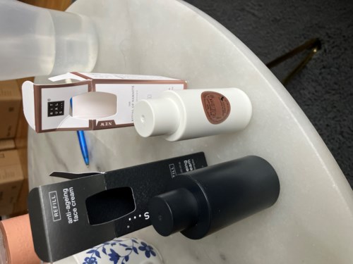Skruva loss ringen under pumpen och ersätt den tomma krämbehållaren med en ny refill. Den tomma behållaren kan återvinnas. Skruva tillbaka ringen ordentligt, så är produkten klar att användas.