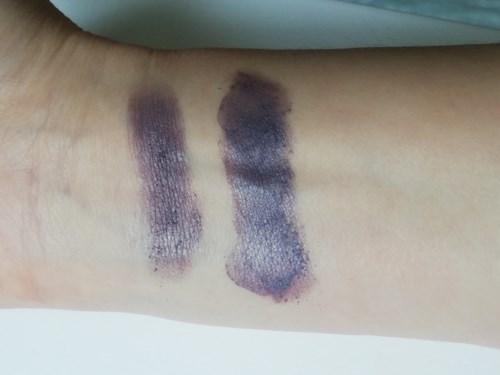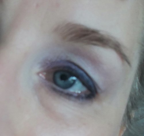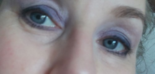 "Enchanted Moonlight" nr 68 är en kall, djup, lilablå ögonskugga. Den kommer i en liten vit något trögöppnad dosa - när jag väl får upp locket glider mitt ena finger ALLTID ned i skuggan - så irriterande. Drar av en stjärna enbart för det. Torr skugga blir matt, väldigt svag i färgen och faller av fort. Använd med blöt pensel blir den mkt intensiv i färgen och får en metallic lyster. Att skuggan faller av när den används torr är rätt irriterande och för mig hände det både med och utan primer + setting powder. Jag har torr hy, numera s k mogen hy med nålfina, sminkförstörande rynkor, men jag har fortfarande rätt oljiga ögonlock. I kombination med att mina ögon är djupt liggande, tätt sittande och dessutom pga ålder börjar få hängande ögonlock/hooded eyes, är det ngt av en utmaning numera att få sminket att inte bara fastna där jag vill, utan också sitta kvar mer än ngn timme! Bästa resultatet med Enchanted Moonlight nr 68 fick jag med en primer och setting powder, sedan applicerade jag skuggan med en rätt platt, fast borste /pensel fuktad med vatten innan jag pressade den horisontellt ned i dosan för att få upp färg och undvika smul. Det blev då inte direkt ngn diskret vardagsmakeup. När jag var helt klar med ögonen inkl eyeliner och mascara, fixerade jag det hela med att lätt trycka en blöt men urvriden bomullsrondell mot ögonområdet (gammalt 80-talstrick!). Sedan satt allt ca 8 h och det var jag nöjd med. Jag har känsliga ögon så det är viktigt att jag slipper sminkpartiklar i ögat. Skuggan var litet svårare att få bort än mina andra ekoskuggor. Med tanke på att den är riktad till framförallt personer som inte längre har ung och slät hy var jag inte superimponerad. Priset är också väl högt. Bilderna: övrig ögonmakeup: Lily Lolos ögonskugga "Eye Candy",ögonprimer Ofra Cosmetics Eye Gel Primer, eyeliner Isadora Perfect Eye Contour 39 Deep Grey, Lily Lolo Natural Mascara i svart. Färgutstrykning av torr (t vänster) och våt Enchanted Moonlight.1 produkt i inlägget RMS Enchanted Moonlight nr 68214 visningar