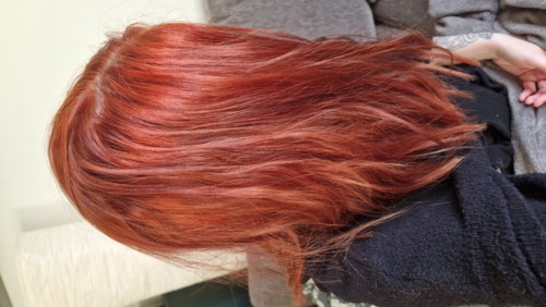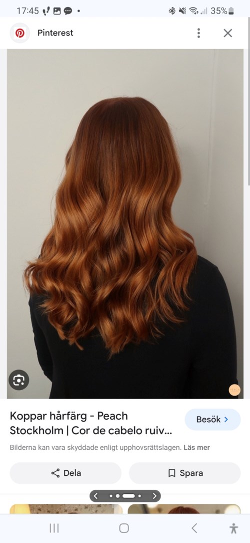 Hejsan! 😊 Jag skulle vilja komma så nära färgen till höger som möjligt, fast kanske något mörkare. Mer ett mörkläge på kanske en 5:a, Vill alltså inte ha en ljus orange koppar ton i håret, utan en mer mörkare koppar. Jag undrar om 7-77 är tillräckligt mörk, eller om jag ska blanda i lite mörkare färg och isåfall vilken? Bilden till vänster är hur mitt hår ser ut nu, jag har använt montibello denuee 6.44 men tyckte den blev för röd. Jag vill inte ha några röda toner i håret helst, utan endast en kopprig ton, gör inget om den går lite åt brunt 😊