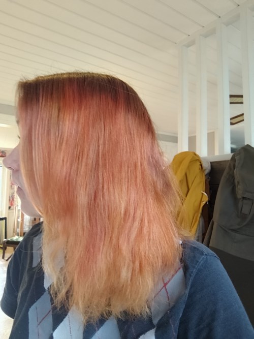 Utgångsläget var urtvättat rosa väldigt ojämnt i färgen. Gjorde först en "fyllning" av håret med Maria nilas färginpackning copper. Sen blandade jag 6-78 och 7-57 för att få färgen på de senare bilderna. I botten använde jag 30g 6-78 och 5g 7-57, i längderna hade jag 40g 7-57 och 10g 6-78. Hade trott att det skulle bli mer skillnad mellan de två nyanserna, men jag är superdupernöjd ändå!!2893 visningar - Inlägget skapades 1 år