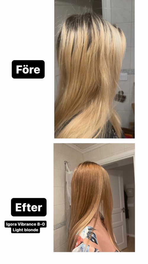 Valde ljusblond Igora Vibrant för den såg mörk ut på färgkartan och ville inte ha för stor skillnad. Tid: valde 20min för att få lite mer färg. Lätt att blanda och applicera med flaska. Nöjd med resultatet. #tävling