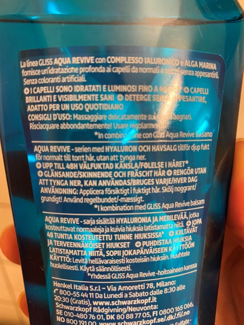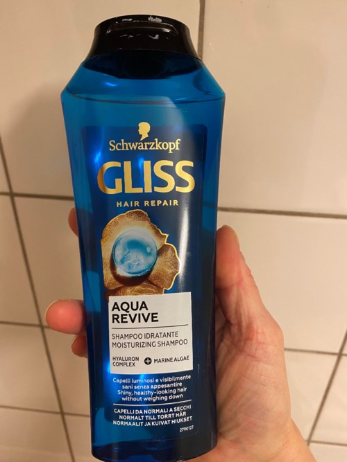 Schwarzkopf Gliss Aqua Revive Schampo 400 ml. Känns ditt hår lite torrt ibland? Precis som torr hud behöver fukt, behöver ditt hår särskild vård. Använd Gliss Aqua Revive- serien för att återfukta ditt hår. GLISS AQUA REVIVE formulan med hyaluron och havsalg återfuktar normalt till torrt hår på djupet.