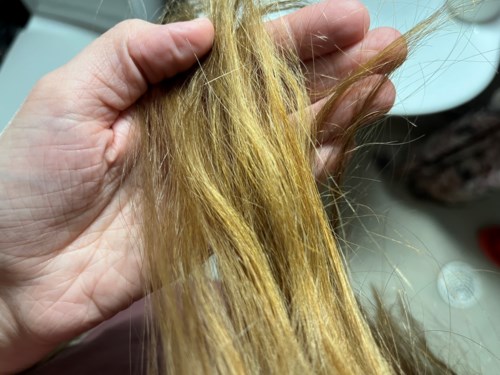 Passar blekt, slingar och grått hår.