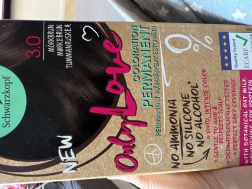 Schwarzkopf Only Love är en permanent hårfärg för intensivt färgresultat. Skonsam för både håret och med respekt för hårbotten. Only Love är en dermatologiskt testad produkt med tre naturliga ingridienser: havremjölk, sojaprotein och arganolja. Utan ammoniak, silikoner och alkohol. Perfekt gråhårstäckning.