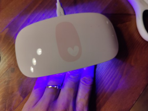 Placera dina naglar under UV LED-lampan, en hand i taget. Tryck på lampans överdel och ha kvar handen tills lampan släcks efter 60 sekunder. Lampan gör att materialet stelnar, vilket både ökar hållbarheten på manikyren och gör att naglarna får en vacker lyster. Tänk på att alla naglar måste in under lampan.