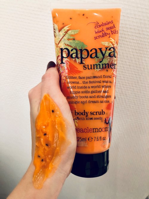 Treaclemoon Papaya Summer Body Scrub luktar fruktig och exotisk. Den milda kroppskrubben ger silkeslen hud med mild peeling effekt tackvare naturliga fina kiwifrön.
