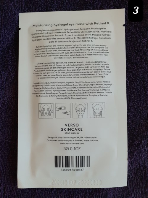 Verso Reviving Eye Mask är en mjukgörande hydrogelmask med retinol 8 som ger energi till huden runt ögonen. Masken är återfuktande och minskar tecken på åldrande. Retinol 8 är ett stabiliserat A-vitaminkomplex som är åtta gånger mer effektivt än standard retinol och samtidigt hälften så irritativt. Det kickar igång hudens föryngringsprocess genom att öka hudens naturliga produktion av kollagen. Hydrogelteknologin har en förmåga att underlätta för retinol 8 och andra aktiva ämnen att penetrera huden för en snabbare effekt. Håller fukten i huden upp till 30 timmar