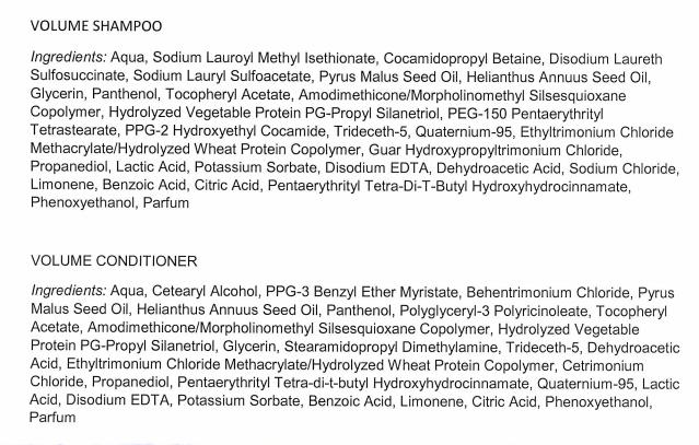 Hydrolyserade sojaproteiner gör håret fylligt och spänstigt. Volumizing Shampoo är färgbevarande, skyddar håret mot UV-strålning och fria radikaler samt är sulfat- och parabenfritt.