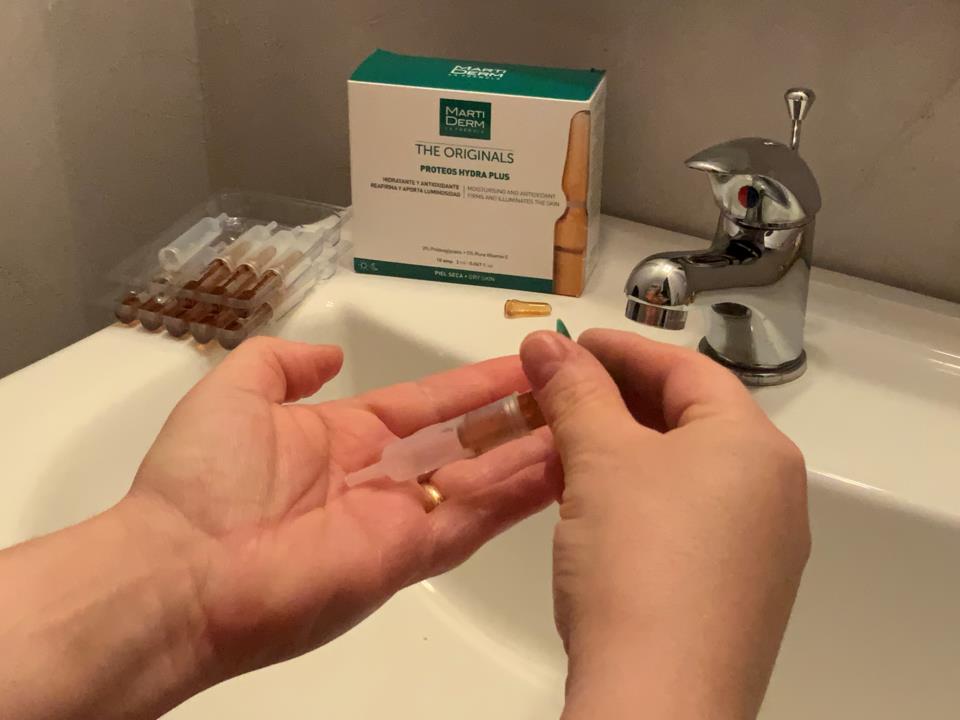 Proteos Hydra Plus ampuller är ett anti age serum som ska ge fukt och ge huden ett Glow och lämnar den smidigare. Daglig användning ska förhindrar och korrigerar rynkor och stärka huden. De fuktar på djupet och verkar uppstramande och med hjälp av en intensiv antioxidant / vitamin C. Hur använder man dem? Ja, förpackningen var aningen förvirrande först men det gav sig ganska snart vad allt var till, det följer med beskrivning som kunde varit enklare! Men så här ska man göra: *Skaka glasampullen försiktigt. *Använd den gråa hylsan som förs över glasampullen ända ner, då bryts spetsen enkelt av automatiskt. Smart grej! *Man får över pipetten och häller ca. 1/3 del eller hälften av innehållet i handflatan och applicera på rengjort ansikte. *Massera in tills det är absorberas! Spara ampullen med resterna i kylskåp till nästa dag. Låt den stå med hjälp av bottenverktyget och använd de små grå delarna till att försluta toppen! Vilken effektiv har jag fått? Jag har passerat 40 års ålder och fått endel tecken på åldrandet vilket jag dessa dagar tycker har blivit mindre. Serumet börjar arbeta från första appliceringen, men den är lite oljigare än nattserumet jag testat och kräver därför mer massage för att absorberas. Tycker det tar en stund också för den att sjunka in. Men jag älskar hur uppstramad och fräsch huden ser ut efteråt. Däremot tilltalade doften mig inte, svårt att beskriva och lite för stark, därav får produkten bara 4 stjärnor! #Lykoinflutester #martiderm