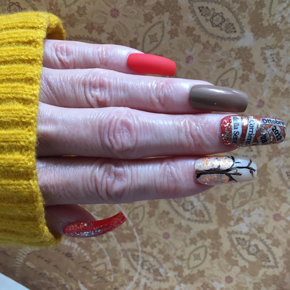 Hej alla fina Lykosar👋🏽🍂🍁🥰! All kärlek till er❤️! Igår fredag blev jag sugen på att göra lite höstnaglar! Jag har under alla mina resor till Italien samlat på mig Italienska tidningar som jag tagit och än tar på flygen dit för framtida ändamål🙌🏽😊! Och jag hittade en tidning från Corriere della sera från 28 oktober (ottobre) 2012😊🍁! Klippte ut dessa detaljer från tidningen och applicerade med pincett på nagel med topcoat🙌🏽! Och glitter såklart🤩! I looken har jag använt lösnaglar från #Depend och nya höstlack från #Mavala Rangoon och Muscat! Dessa båda lack svampade jag på tumme ovanpå orange lack för att få lite ”stämning” under glitter GlamFizz och orange fin lösglitter från Systrene Grene som jag fäst med blandat med topcoat från #nailmatic! Pekfinger har jag Mavalas Nicosia...himla fint lack😍! Trädet är målat med #essie Licorice med detalj pensel, efter duttat i lite med Rangoon för ”liv”😊! Hör har jag också duttat på med lite orange glitter och GlamFizz som symboliserar höstens ingång med sina lövnyanser! Ringfinger med vackra färgen Muscat😍! Lillfinger Orange färg ELIF #Makeupstore som jag sen topcoatat med essies Matte! Hoppas ni gilla looken och önskar er alla en superfin, bella giornata....Benvenuto Autunno🍂❤️🍁🧣🧥😍! Un abbraccio fortissimo...Stor kram och takecare as usual🤗🥰🍁 See U soon👋🏽🍂🥰 #NailsByAka