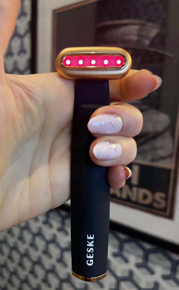 Om du vill ha en effektiv men smidig, liten och prisvärd bit beauty tech så har du allt du behöver här! Här har du en massa teknologier insatta i en liten pluttig mojäng: 1. SmartSonic Pulsation: Stimulerar, rengör och förbättrar hudens struktur. 2. MicroCurrent: Lyfter, stramar och förbättrar hudens elasticitet. 3. Youthful Glow Massage: Förbättrar lymfdränage och ger en hälsosam lyster. 4. Red Light: Reducerar fina linjer, rynkor och förbättrar hudens elasticitet. 5. Thermo Deep Warming: Förbättrar hudens absorption av produkter och främjar avslappning. 6+7 Skin Scan & Personal Routine Guide: Ger en skräddarsydd hudvårdsplan i appen. Så detta är ju inte med i själva staven, men Geske räknar det som två av punkterna i "7 in 1" Men några tips och varningens ord: vill du ha rejält med effekt så använder du Firming Wand tillsammans med en gel. Det kan vara vilken gel som helst, Aloe Vera, en tjock toner, ett tjockt serum eller en specialanpassad ledningsgel. Då blir det åka av eftersom du då kommer känna av mikroströmmen REJÄLT. Obs, ej för veklingar! Vill du mjukstarta kör du utan gel, då tar inte mikroströmmen lika hårt. Behandlingen känns rejält men det går snabbt! Du kan se på sista bilden hur röd huden blir av mikroströmmen och värmen. Det är SÅÅ smidigt att du kan vrida på själva "huvudet" på wanden. det gör att du både kommer åt på små områden som runt ögonen, men också stora områden såsom kinderna och under hakan. Koppla ihop wanden med Geskeappen och få en massa fler tips!